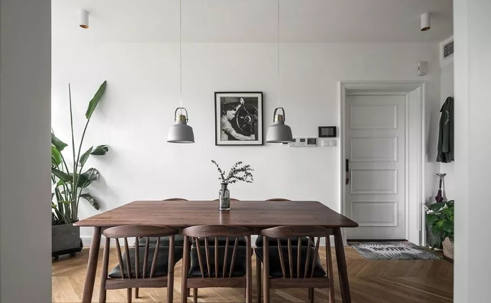 设计师的服务内容会在装修过程中全程跟单,软装也占了很大的一部分。设计师会提供软装清单,只要业主根据清单去各个平台购买就好。 设计师在这里给兔友们一些家具、洁具的清单,仅供参考。 家具可以参考:北欧表情、commune这里的沙发是commune的,有三款尺寸,可以具体根据自己的户型大小购买,面料有棉麻混纺或牛皮。 餐厅 设计师把餐厅和客厅设计在同一个空间,中间用过道来分割两个区域。(大门也是之前说的那样用白色的漆喷的。餐桌餐椅都购买于北欧表情。 )餐桌餐椅的颜色略深于地板,有一个很好的对比递进的作用。餐桌的两边最好要留有一定的距离,这样能够更好的给人行走。所以在装修的时候,设计师把卧室、卫生间和餐桌墙面向里移动了一定的距离。