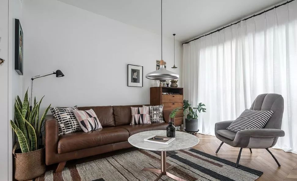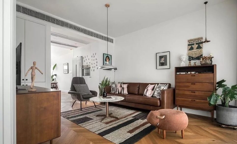 一举三得 1、当作一个过渡空间 2、增加储物功能 3、隐藏冰箱和烤箱 如果想要通透、宽敞,又担心空间不够存粹的时候可以这样设计。 客厅 客厅是整个风格设计的重点,这里用的地板是人字形地板,淘宝买的,价格大概在500~600元/平方之间。人字形地板和普通的地板有一个差别,那就是人工会比一般的要贵。人字形地板对地坪要求比较高,如果工人师傅不能很好找平的话,就要做自流平,这样价格还要加个三十几块一平。大的地板品牌会帮着做,但是小的就不会了。